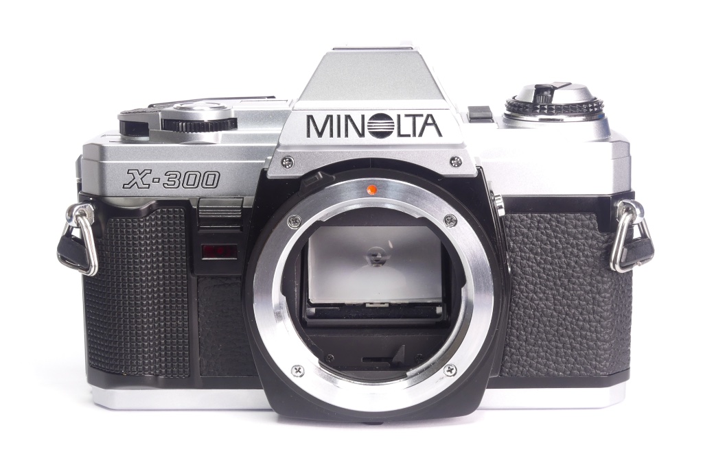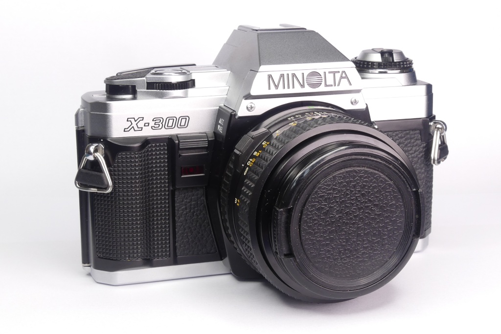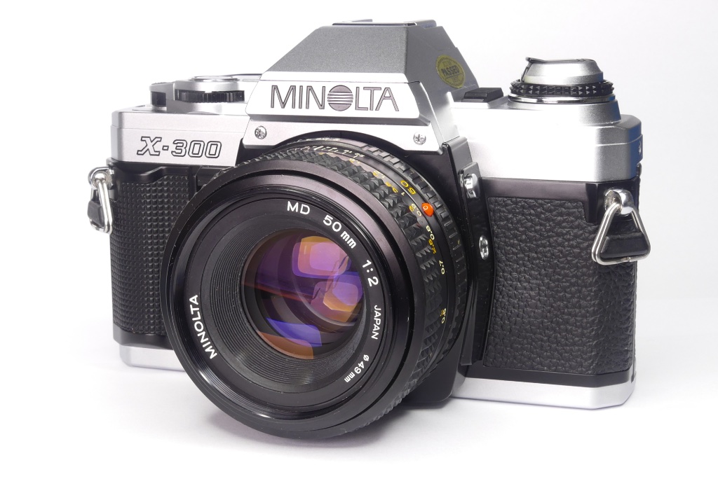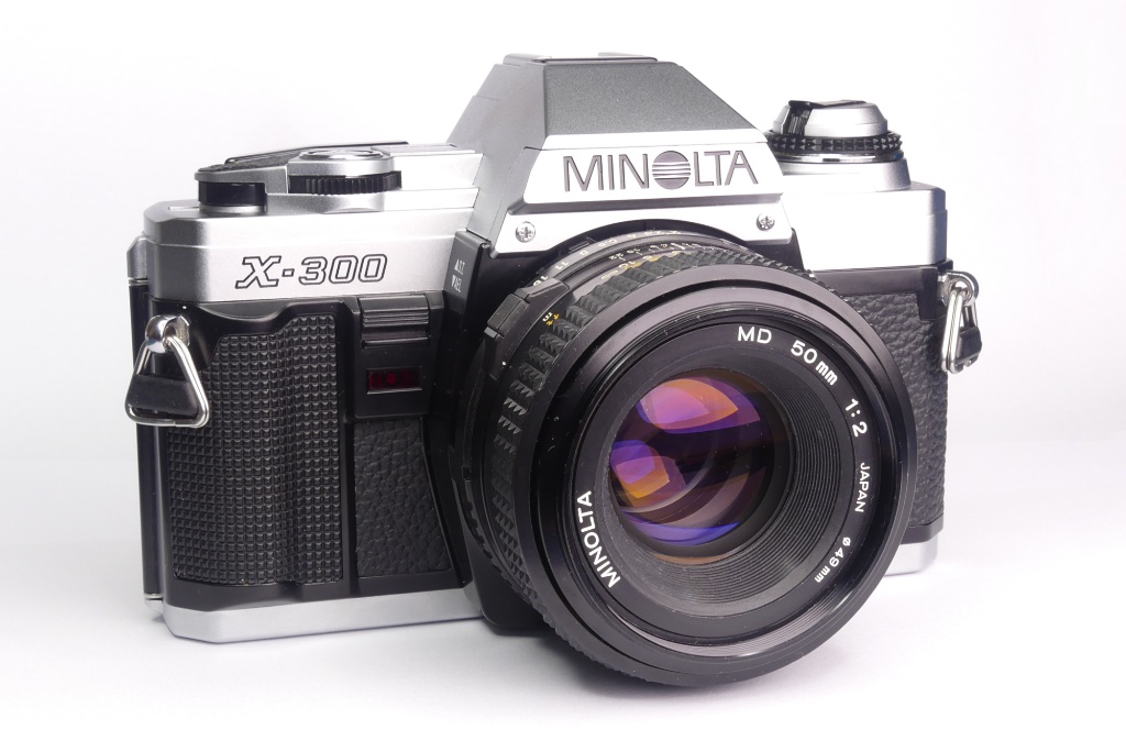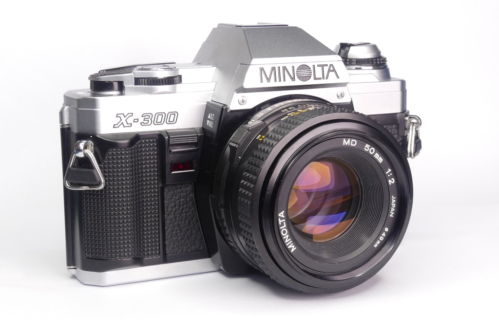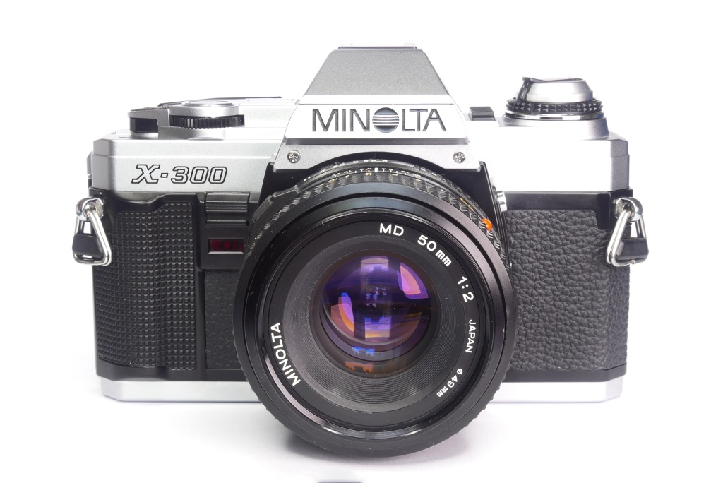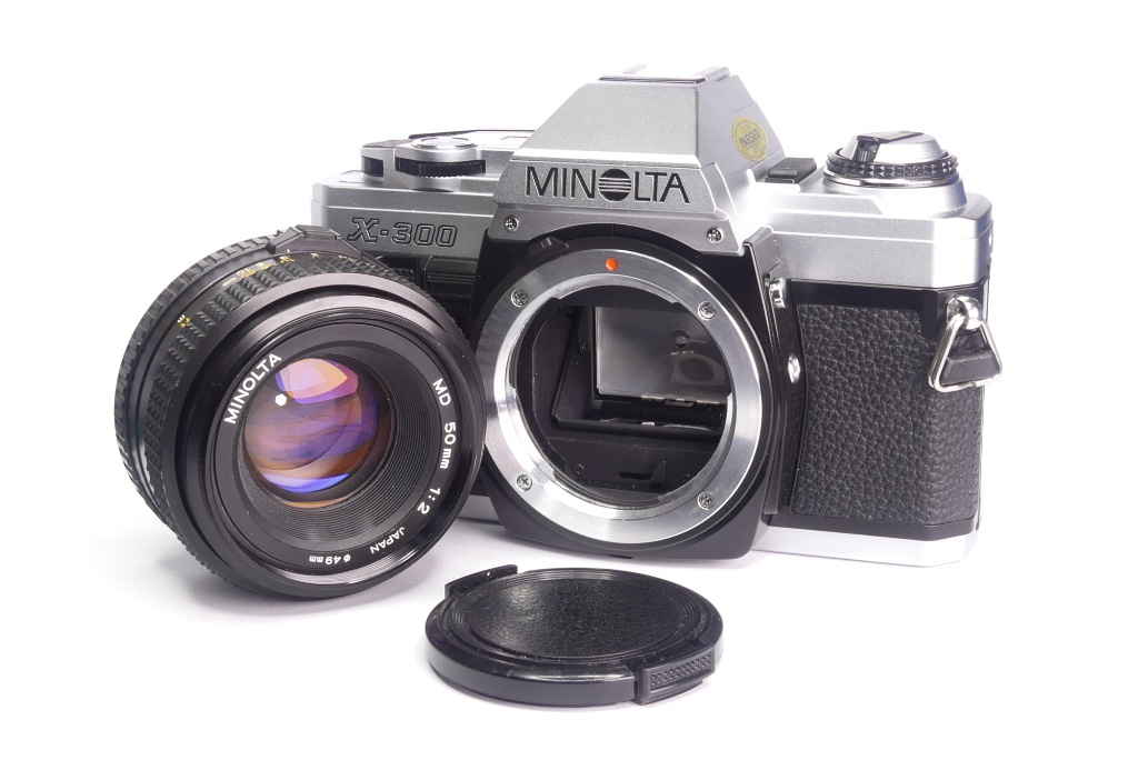 Minolta X-300 SLR 35mm Film Camera (serial 1079202) made in Japan model and manufactured in July 1984. Camera supplied with a fully refurbished MD3 50mm f2 lens (Serial 1063783).
