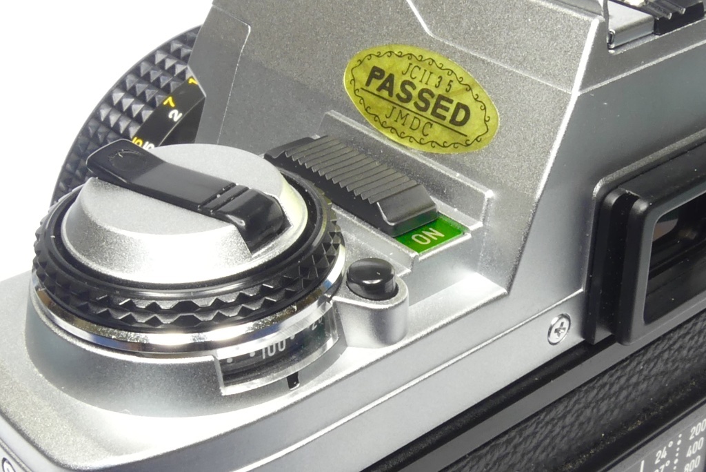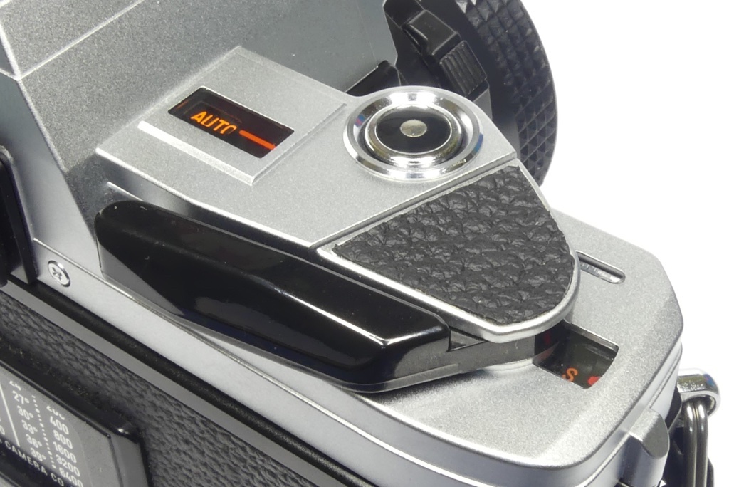 Camera body shows some small wear marks and the cover on the rewind lever was missing. We have replaced this with a leatherette matching the camera.